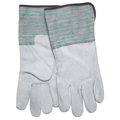 This C grade select shoulder leather glove offers excellent protection at an affordable price. The 1380 features features green fabric back with pink stripes, full leather back and a 4.5 inch rubberized safety cuff.