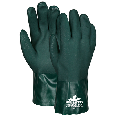 These MCR Safety Premium PVC gloves are specially formulated to hold up in petrochemical applications. Two layers of sandy textured green PVC reinforced by nitrile offer toughness and abrasion resistance you'll need on the job. Glove lengths in this premium series range from knit wrist options to 18 inch gauntlet cuff options. The 6412 is double dipped in green PVC, has a sandy finish, jersey lining, and is treated with ActiFresh to help prevent odors and eliminate bacteria caused by perspiration. Measures 12 inches in length. Looking for the best PVC coated work gloves? Don't settle for the rest, but get the best with MCR Safety!