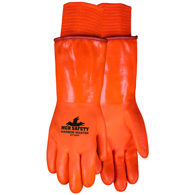 Help protect your hands from cold temperatures! The 6714FF gloves have a smooth hi-visibility orange PVC coating that not only help keep your hands safe, but help you to be seen! These gloves also feature an internal knit wrist that will help keep the cold out and the warm air produced by your hands inside the glove. The 6714FF glove is 14 inches in length and fully coated to provide more protection throughout your workday. If you are looking for the best PVC coated work gloves, look no further than MCR Safety!