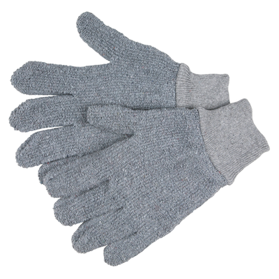 Most terry cloth is made with cotton because the absorbent fiber gets stronger when wet and it can be sanitized in very hot water using strong bleach and detergent without harm. Terry cloth also provides excellent thermal properties and is most often used for light heat applications in the industrial market. The 9422KM features 22 ounce gray regular weight cotton blend with a knit wrist and is size small.  Looking for the best terrycloth glove options?  Look no further than MCR Safety!