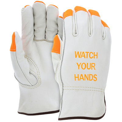 From wranglin' to buildin', these gloves are tough for the job! Cowhide is the most commonly used leather due to availability. Characteristics include a good balance between abrasion resistance, dexterity, durability and comfort. The 3213HVI series features CV Grade grain leather, orange fingertips, Watch Your Hands orange logo, and keystone thumb.