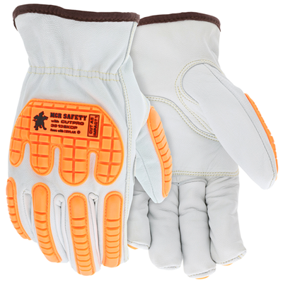 MCR Safety strives to create the most comfortable and durable leather products on the market. The 36136KDP includes goatskin that provides extreme comfort and dexterity. This supple leather contains natural lanolin that helps create a very soft feel. Characteristics include strongest tensile strength and excellent tactile sensitivity. Best combination of flexibility and comfort. The 36136KDP features select grade grain goatskin leather, shirred elastic back, and keystone thumb. The 36136KDP includes a cut resistant DuPont Kevlar liner for added protection.. The hi-visibility orange TPR on the back of the glove provides ANSI 138 Level 1 Impact Protection. The addition of a padded double palm provides abrasion resistance and vibration reduction.