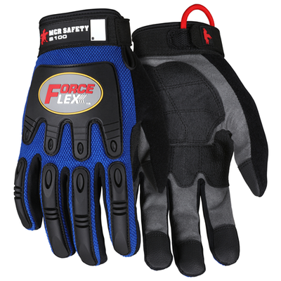 The ForceFlex mechanics gloves provide the ultimate back of hand impact protection while providing full flexibility and range of motion. The B100 full finger mechanics gloves features ergonomically designed synthetic leather palm with rough grip palm pad, injection molded TPR padding on the back of hand and fingers for full dorsal metacarpal protection, and extra tacky fingertips. The blue mesh fabric backing provides comfort and breathability. Looking for the best mechanics work gloves? Look no further than MCR Safety!