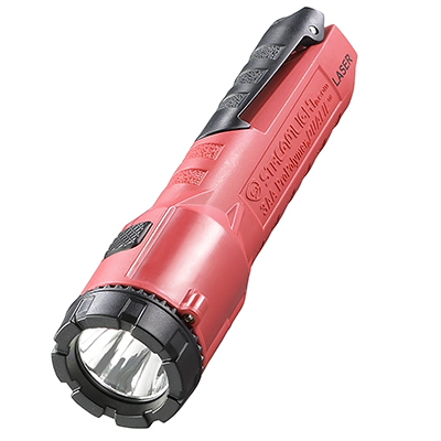 This flashlight features one white LED and a red laser to see what's ahead of you and also pinpoint objects at a distance. It has three lighting modes: spot, laser, and spot and laser simultaneously. Dual head switches on either side of the body for easy beam selection and one-handed operation. Durable, non-conductive, corrosion-proof polymer resin and a rocky stipple texture for a sure grip.