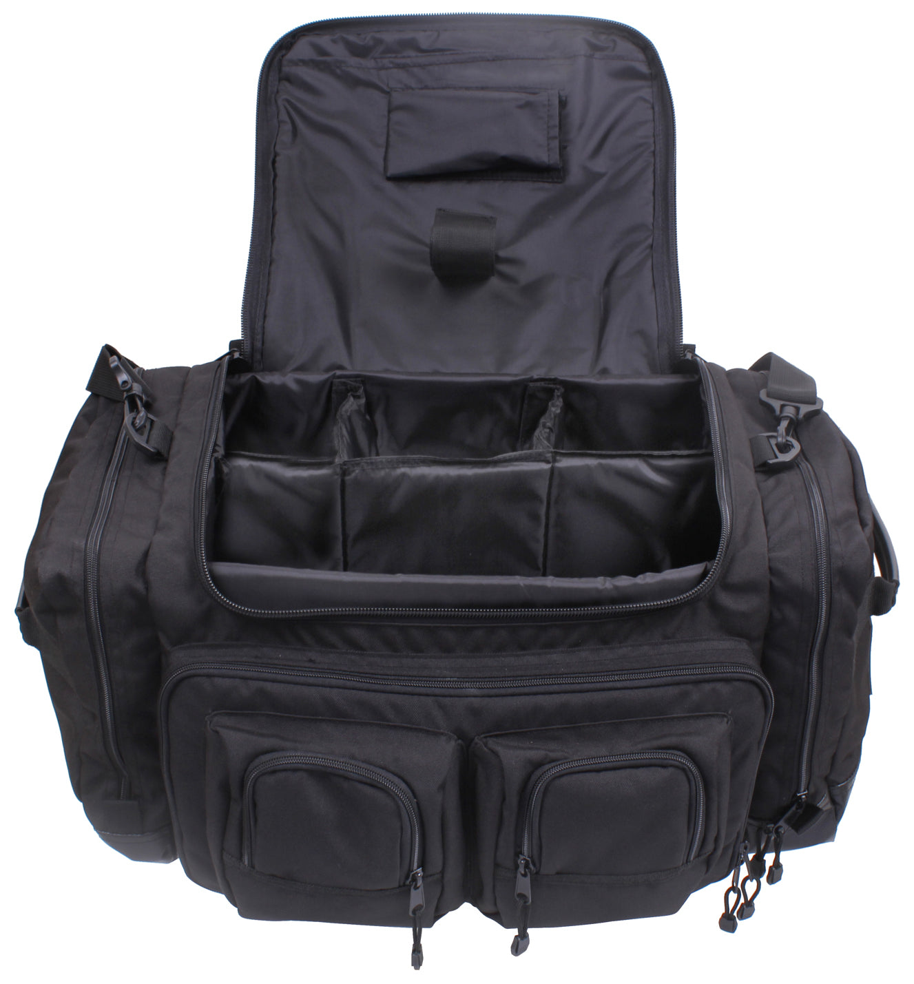 The Rothco Deluxe Law Enforcement Gear Bag is the perfect companion for police and law enforcement. The duty bag features a large main compartment with a removable liner & dividers, two large outer pockets on each end, and cargo handles. Inside of the top flap you'll find a large pocket with a smaller pouch. There's also a large front zippered compartment and two smaller front zipper pouches and a zippered compartment on the back of the bag. The gear bag measures 12.25" x 8" x 2.25" and is made of a durable polyester material and features a water resistant bottom. Also comes with an adjustable shoulder strap. WARNING: This product contains a chemical known to the State of California to cause cancer, birth defects and other reproductive harm.