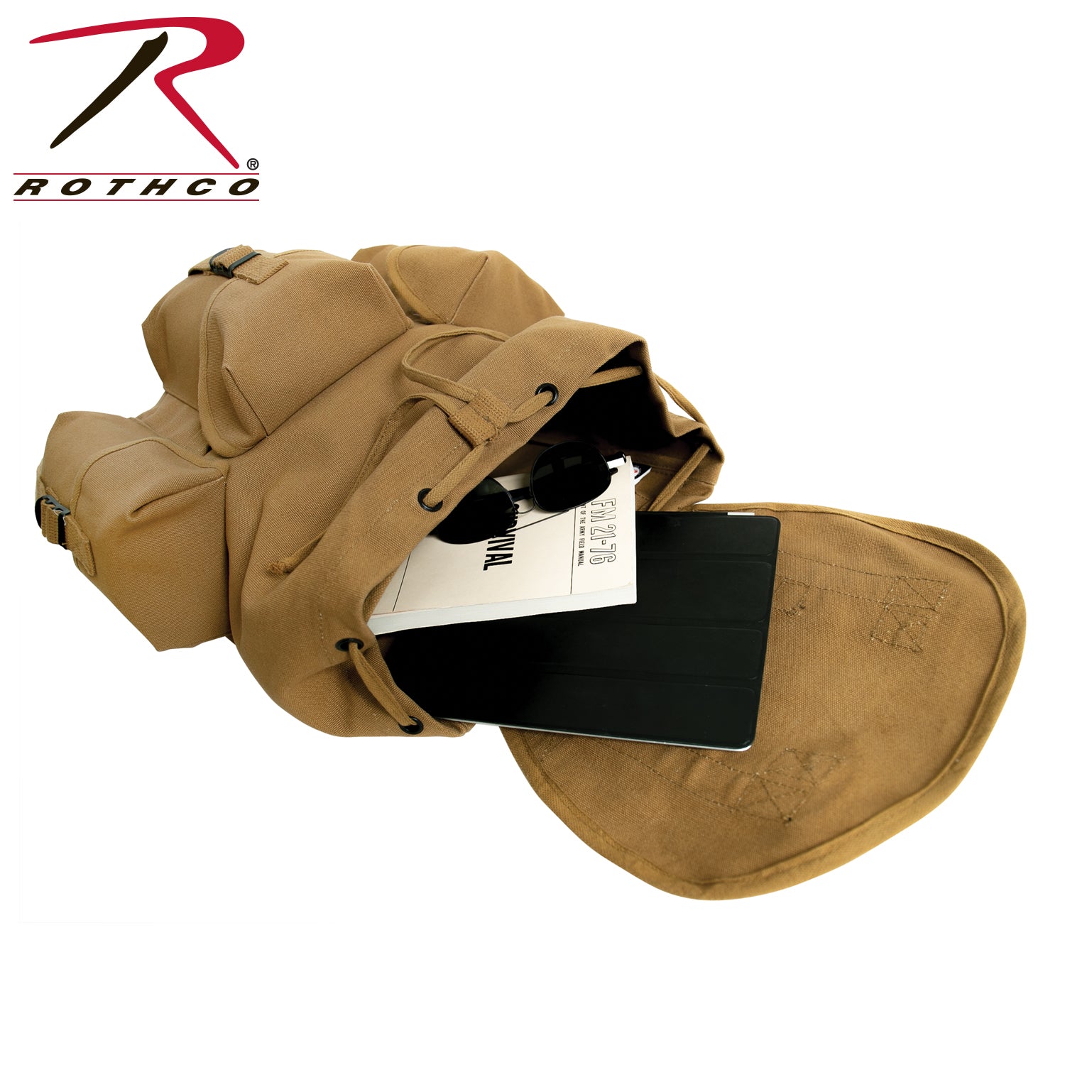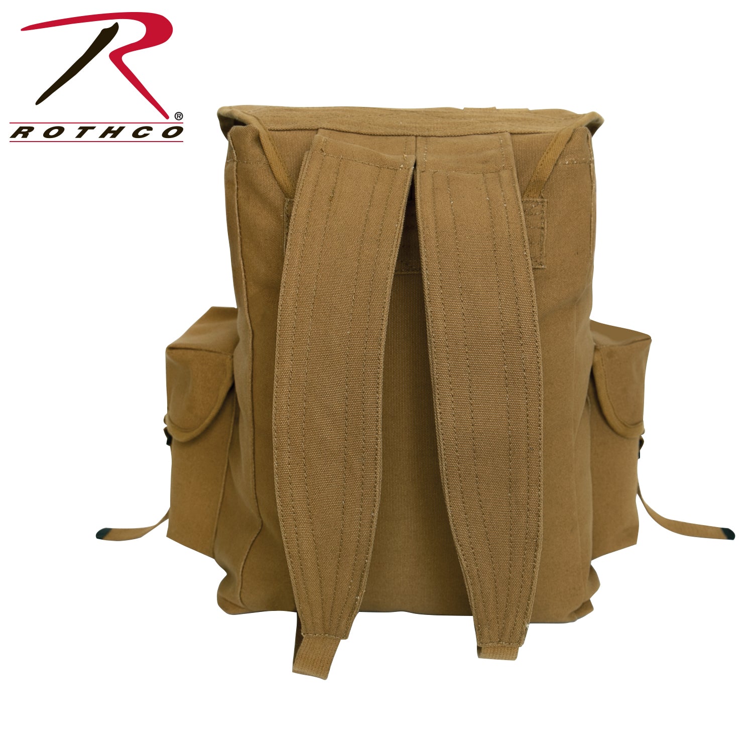 Modeled after the classic Alice backpack, Rothco’s Heavyweight Mini Alice Pack is the compact alternative to the original Military Alice Pack. Measuring 12.75” x 5.75” x 16”, the Alice (All-Purpose Lightweight Individual Carrying Equipment) backpack’s main compartment and three outside pockets are perfect for storing all your essential military, camping, and outdoor supplies. Designed with heavyweight canvas material, reinforced stitching, and durable double-layer adjustable shoulder straps, the military pack provides combat-tested strength to withstand the weight of your gear. The drawstring top and adjustable flap closure will keep your contents safely secure. Included on the flap closure are canvas strap loops so you can attach a tent or sleeping bag while you travel to your next destination. Frame not included.