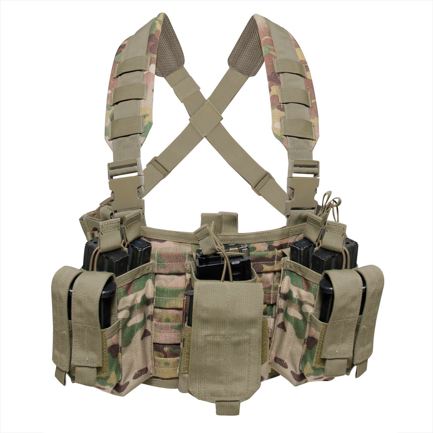 Rothco Chest Rig Vest Features 600D Polyester, 3-Double Open Top Rifle Mag Pouches W/Drain Holes, 3-Double Mag Pistol Pouches W/Hook & Loop Flap Closures, Adjustable Mesh Padded Cross-Back Shoulder Straps W/2-D-Rings, 2-Swivel Push-Button Release Buckles & 2-Side Release Buckles, Quick Release Waist Cinch Strap, Interior Document Pocket W/Hook & Loop Closure, 9" X 6" Padded Mesh Pocket W/Hook & Loop Closure, M.O.L.L.E. Compatible.