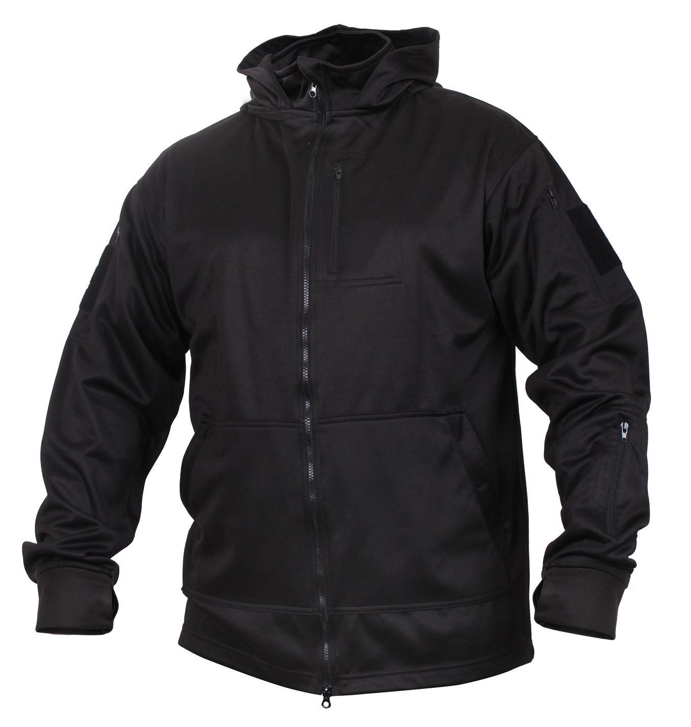 Rothco’s Tactical Zip Up Hoodie offers covert comfort with a breathable 100% Polyester material and soft fleece lining. The tactical hoodie was built with form and function in mind; the zipper hoodie features two side kangaroo pockets each with zipper closure and wire pass through, a left chest pocket with zipper closure and wire pass-through ports, and the left sleeve is equipped with a pocket which features a 3.75" X 3.75" loop field which is ideal for attaching a morale patch or insignia rank. The sweatshirt features a mandarin collar with full zipper guard at the top for maximum comfort and extra large hood.