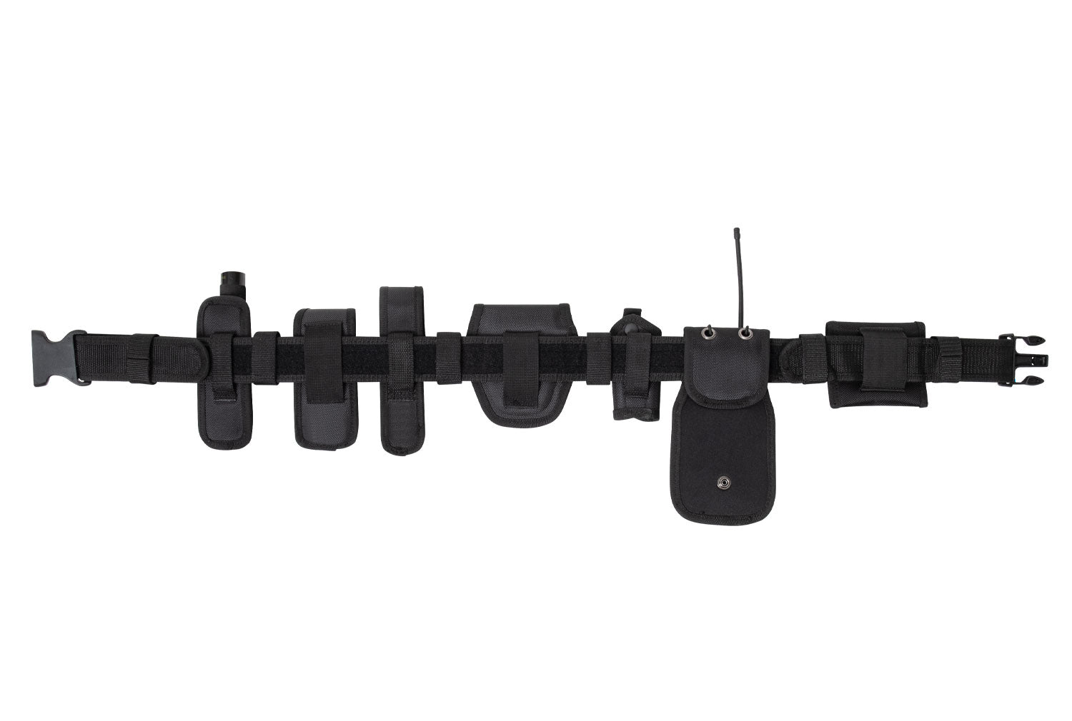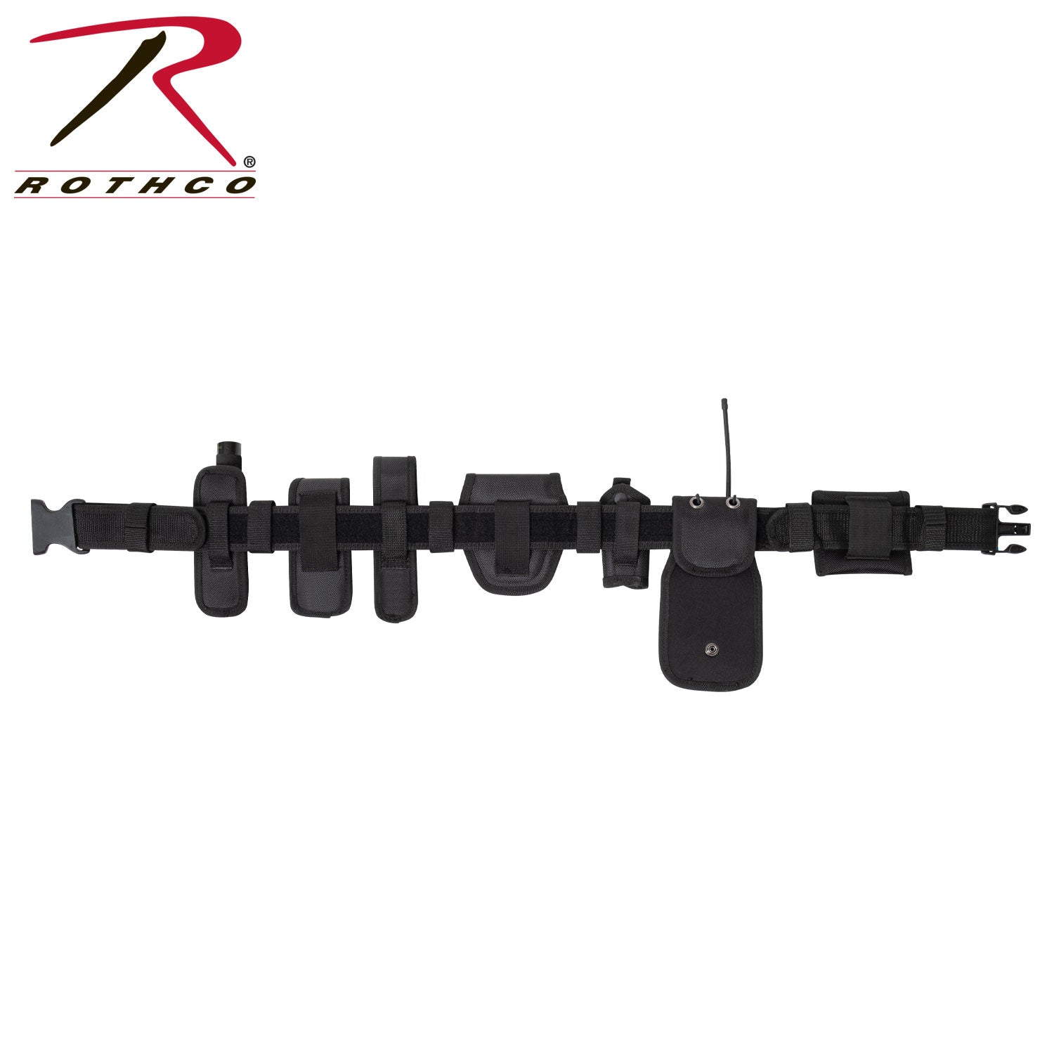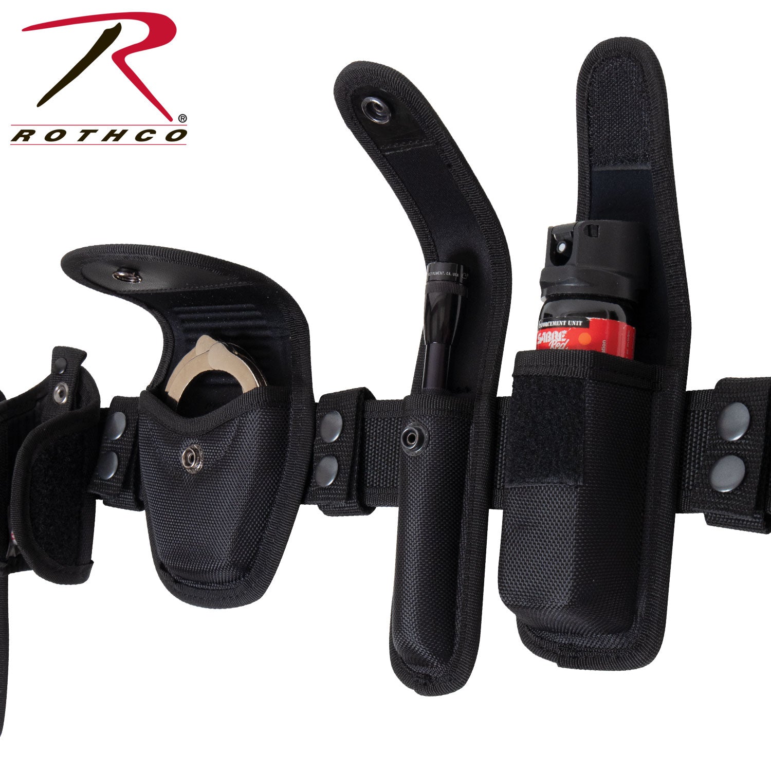 Rothco’s Deluxe Duty Belt Rig is a completed modular pouch system for public safety and law enforcement professionals, featuring a baton holder, handcuff case, radio pouch, and other modular gear. The deluxe triple retention buckle belt can securely fasten to an inner duty belt with the interior hook field and the four enhanced snap button belt keepers. Seven modular pouches are featured with the police duty belt, which includes a silent key holder, handcuff case, a pepper spray holder that can fit most small canisters (item #20010), a heavy-duty latex glove pouch, mini Maglite holder, a universal radio pouch, and a baton holder. Each attachable and removable module is molded with enhanced ballistic material and made of long-lasting denier polyester. This utility belt is ideal for police officers, security guards, and other law enforcement personnel.