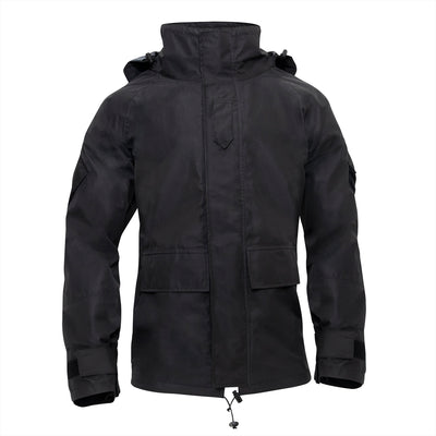Dominate extreme weather conditions with our lightweight and breathable Tactical Hard Shell Waterproof Jacket. This military jacket is ideal for rugged use with a three-layer composition, a water-resistant material coating, and a three-layer sealing tape that keeps you dry in extreme wet weather. With Six pockets located on the front, biceps, and concealed in the chest of the hard shell jacket that seal with hook-and-loop closures, this rain jacket has plenty of space for storing tactical gear and rations. The windbreaker jacket has a stow-away hood with cinch cord and barrel lock adjusters large enough to fit over most military and tactical helmets, making this tactical hard shell jacket a must-have for inclement weather missions. Hook-and-loop wrist cuffs on the tactical jacket ensure a complete dry seal between your jacket and gloves while the drawstring bottom secures it tightly above your duty belt for easy military and tactical access. The hard shell jacket also comes with underarm zipper vents that enable you to cool down during long, strenuous activities like hiking to your favorite fishing spot. Additionally, a strategically-placed snap-on closure located on the seven-snap storm flap makes it easy to mount badges or insignias on your rain coat.