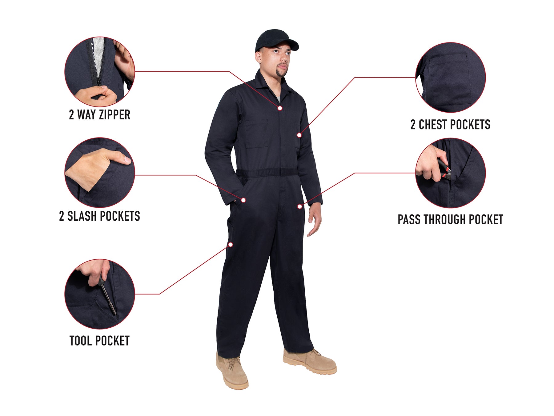 Rothco’s Workwear Coverall features a lightweight yet durable composition so you can perform your professional duties with confidence. This coverall is ideal for mechanics, electricians, engineers, and more. The two-way zipper closure on the coverall is concealed by a button closure for a clean, professional appearance. The pass-through pocket at the waist of the workwear coverall is great for holding large items or just warming your hands. The coverall features two front chest pockets, two slash pockets, two back pockets, and a tool pocket on the right thigh. The lightweight coverall also features a bi-swing back for enhanced mobility.