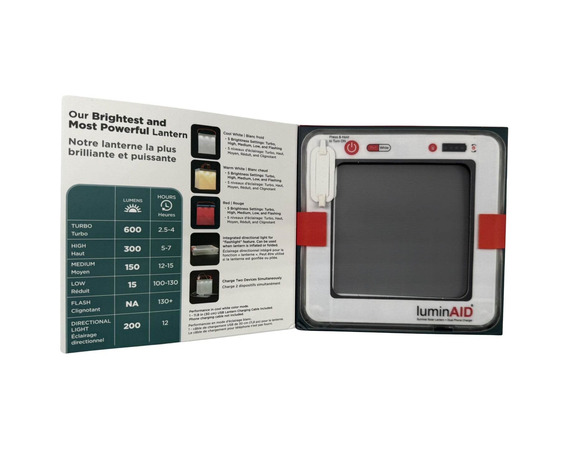 The LuminAID Survivor is a solar inflatable lantern & dual phone charger capable of charging two phones at once! This lantern packs flat for easy carrying and charging on the go. It's the perfect all-purpose solar lantern to light up your home, campsite, or tent for emergencies or adventures.