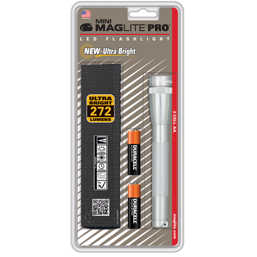 Mini Maglite Pro 2AA LED Flashlight features the iconic Mini-Mag design paired with a 272-lumen LED emitter. Simply rotate the bezel to turn it on and off and to focus the beam from a tight spot to a wide flood light. Its aluminum body has a scratch- and corrosion-resistant finish and is O-ring sealed for water resistance. The Mini Maglite Pro comes with a pair of AA batteries.
