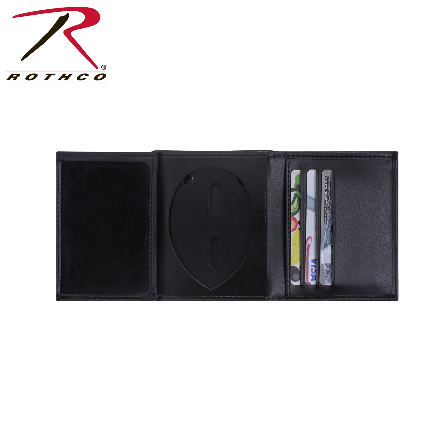 Rothco’s Leather ID Badge and Wallet provides police and public safety professionals with a place to store their badge, cash, cards, IDs, and more. The trifold wallet features seven card slots, a cash slot, and a removable badge tab with protective padding. The badge tab is designed to accommodate shield shaped badges (see item #1925). The wallet measures 10.5 inches x 4.5 inches x .25 inches when open, and 4.5 inches x 3 5/8 inches x .5 inches when closed.