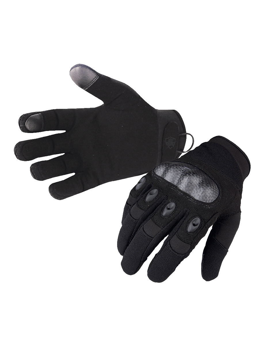 These 5ive Star Gear Tactical Hard Knuckle Gloves are designed for laborers and tactical operators alike with key features that are needed in the field. Such as a sleek profile that allows for better control of weapons and tools. Rugged synthetic leather palm and 4-way stretch fingers encourages a more natural hand movement with a snug next-to-skin feel. Mesh areas and rubber exhaust ports increase breathability while working to keep sweat at a minimum. Raised carbon fiber knuckle plating provides enhanced protection. And, they have a touchscreen compatible pad on index finger and thumb to let you operate your touchscreen device without removal.